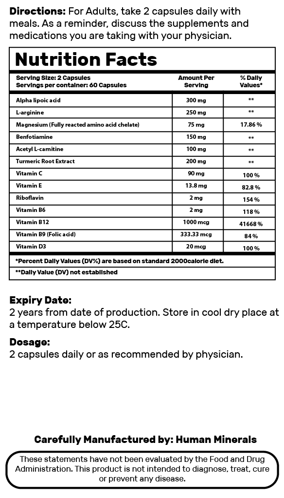 Neurotonic is available in a sealed container of 60 capsules. Each capsule contains Alpha lipoic acid-arginine, Magnesium (Fully reacted amino acid chelate), Benfotiamine, Acetyl L-carnitine, turmeric Root, Vitamin E, Vitamin C, Riboflavin, Vitamin B6, Vitamin B12, Vitamin B9, Vit D3