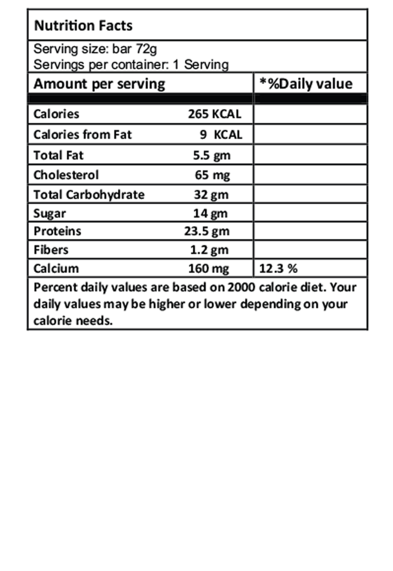 Dosage: Use one bar pre or post workout & another one before bed time , Can be used as a snake at any time during the day